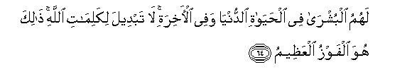 64. Lahumu albushra fee alhayati alddunya wafee al-akhirati la tabdeela likalimati Allahi thalika huwa alfawzu alAAatheemu