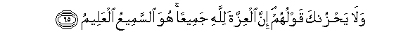 65. Wala yahzunka qawluhum inna alAAizzata lillahi jameeAAan huwa alssameeAAu alAAaleemu