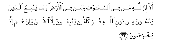 66. Ala inna lillahi man fee alssamawati waman fee al-ardi wama yattabiAAu allatheena yadAAoona min dooni Allahi shurakaa in yattabiAAoona illa alththanna wa-in hum illa yakhrusoona