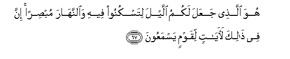 67. Huwa allathee jaAAala lakumu allayla litaskunoo feehi waalnnahara mubsiran inna fee thalika laayatin liqawmin yasmaAAoona