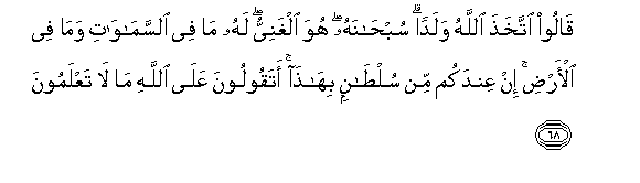 68. Qaloo ittakhatha Allahu waladan subhanahu huwa alghaniyyu lahu ma fee alssamawati wama fee al-ardi in AAindakum min sultanin bihatha ataqooloona AAala Allahi ma la taAAlamoona