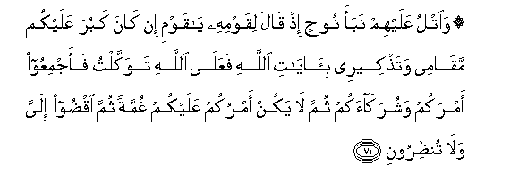 71. Waotlu AAalayhim nabaa noohin ith qala liqawmihi ya qawmi in kana kabura AAalaykum maqamee watathkeeree bi-ayati Allahi faAAala Allahi tawakkaltu faajmiAAoo amrakum washurakaakum thumma la yakun amrukum AAalaykum ghummatan thumma iqdoo ilayya wala tunthirooni