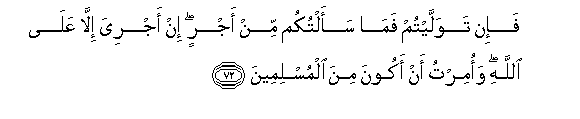 72. Fa-in tawallaytum fama saaltukum min ajrin in ajriya illa AAala Allahi waomirtu an akoona mina almuslimeena