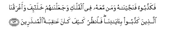 73. Fakaththaboohu fanajjaynahu waman maAAahu fee alfulki wajaAAalnahum khala-ifa waaghraqna allatheena kaththaboo bi-ayatina faonthur kayfa kana AAaqibatu almunthareena