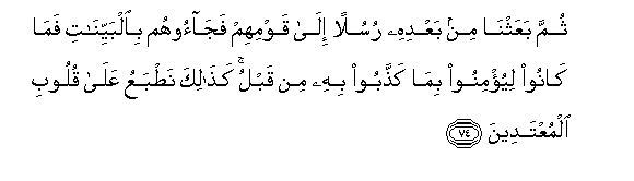 74. Thumma baAAathna min baAAdihi rusulan ila qawmihim fajaoohum bialbayyinati fama kanoo liyu/minoo bima kaththaboo bihi min qablu kathalika natbaAAu AAala quloobi almuAAtadeena