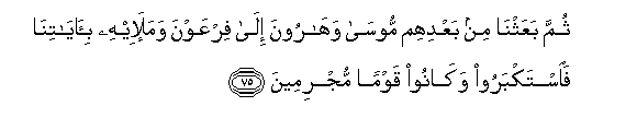 75. Thumma baAAathna min baAAdihim moosa waharoona ila firAAawna wamala-ihi bi-ayatina faistakbaroo wakanoo qawman mujrimeena