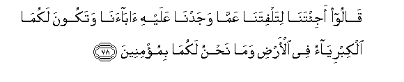78. Qaloo aji/tana litalfitana AAamma wajadna AAalayhi abaana watakoona lakuma alkibriyao fee al-ardi wama nahnu lakuma bimu/mineena