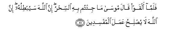 81. Falamma alqaw qala moosa ma ji/tum bihi alssihru inna Allaha sayubtiluhu inna Allaha la yuslihu AAamala almufsideena