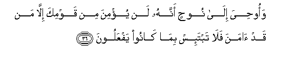 36. Waoohiya ila noohin annahu lan yu/mina min qawmika illa man qad amana fala tabta-is bima kanoo yafAAaloona