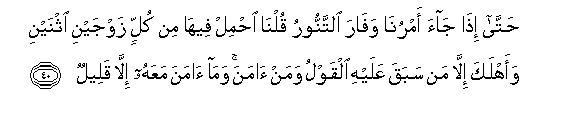 40. Hatta itha jaa amruna wafara alttannooru qulna ihmil feeha min kullin zawjayni ithnayni waahlaka illa man sabaqa AAalayhi alqawlu waman amana wama amana maAAahu illa qaleelun