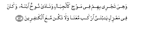 42. Wahiya tajree bihim fee mawjin kaaljibali wanada noohunu ibnahu wakana fee maAAzilin ya bunayya irkab maAAana wala takun maAAa alkafireena