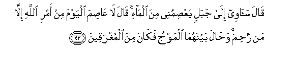 43. Qala saawee ila jabalin yaAAsimunee mina alma-i qala la AAasima alyawma min amri Allahi illa man rahima wahala baynahuma almawju fakana mina almughraqeena