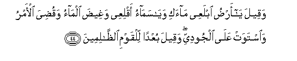 44. Waqeela ya ardu iblaAAee maaki waya samao aqliAAee wagheeda almao waqudiya al-amru waistawat AAala aljoodiyyi waqeela buAAdan lilqawmi alththalimeena
