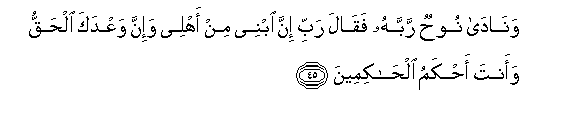 45. Wanada noohun rabbahu faqala rabbi inna ibnee min ahlee wa-inna waAAdaka alhaqqu waanta ahkamu alhakimeena