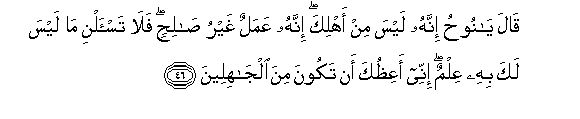 46. Qala ya noohu innahu laysa min ahlika innahu AAamalun ghayru salihin fala tas-alni ma laysa laka bihi AAilmun innee aAAithuka an takoona mina aljahileena