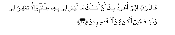 47. Qala rabbi innee aAAoothu bika an as-alaka ma laysa lee bihi AAilmun wa-illa taghfir lee watarhamnee akun mina alkhasireena