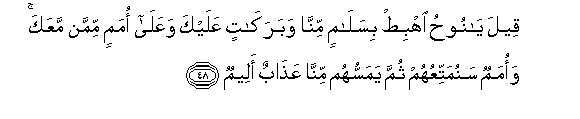 48. Qeela ya noohu ihbit bisalamin minna wabarakatin AAalayka waAAala omamin mimman maAAaka waomamun sanumattiAAuhum thumma yamassuhum minna AAathabun aleemun
