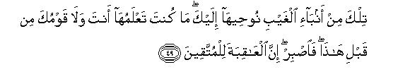 49. Tilka min anba-i alghaybi nooheeha ilayka ma kunta taAAlamuha anta wala qawmuka min qabli hatha faisbir inna alAAaqibata lilmuttaqeena