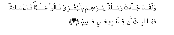 69. Walaqad jaat rusuluna ibraheema bialbushra qaloo salaman qala salamun fama labitha an jaa biAAijlin haneethin