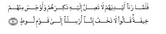 70. Falamma raa aydiyahum la tasilu ilayhi nakirahum waawjasa minhum kheefatan qaloo la takhaf inna orsilna ila qawmi lootin