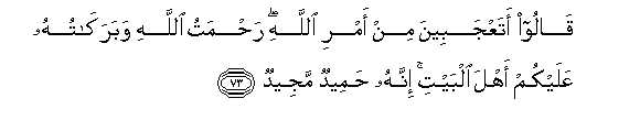 73. They said: "Dost thou wonder at Allah.s decree? The grace of Allah and His blessings on you, o ye people of the house! for He is indeed worthy of all praise, full of all glory!"