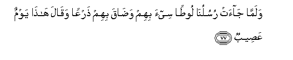 77. Walamma jaat rusuluna lootan see-a bihim wadaqa bihim tharAAan waqala hatha yawmun AAaseebun