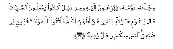 78. Wajaahu qawmuhu yuhraAAoona ilayhi wamin qablu kanoo yaAAmaloona alssayyi-ati qala ya qawmi haola-i banatee hunna atharu lakum faittaqoo Allaha wala tukhzooni fee dayfee alaysa minkum rajulun rasheedun