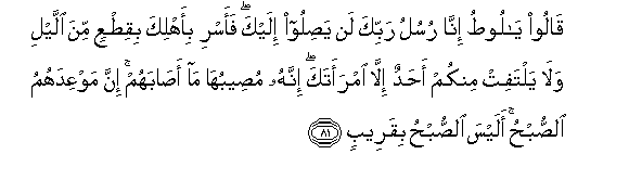 81. Qaloo ya lootu inna rusulu rabbika lan yasiloo ilayka faasri bi-ahlika biqitAAin mina allayli wala yaltafit minkum ahadun illa imraataka innahu museebuha ma asabahum inna mawAAidahumu alssubhu alaysa alssubhu biqareebin