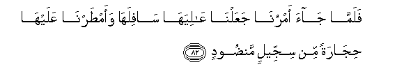 82. Falamma jaa amruna jaAAalna AAaliyaha safilaha waamtarna AAalayha hijaratan min sijjeelin mandoodin