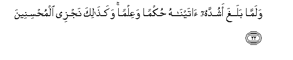 22. Walamma balagha ashuddahu ataynahu hukman waAAilman wakathalika najzee almuhsineena