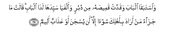 25. Waistabaqa albaba waqaddat qameesahu min duburin waalfaya sayyidaha lada albabi qalat ma jazao man arada bi-ahlika soo-an illa an yusjana aw AAathabun aleemun