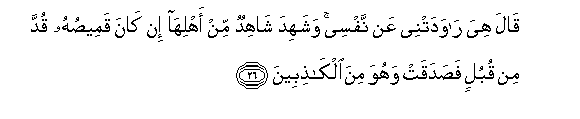 26. Qala hiya rawadatnee AAan nafsee washahida shahidun min ahliha in kana qameesuhu qudda min qubulin fasadaqat wahuwa mina alkathibeena