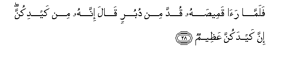 28. Falamma raa qameesahu qudda min duburin qala innahu min kaydikunna inna kaydakunna AAatheemun