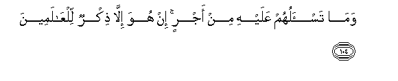104. Wama tas-aluhum AAalayhi min ajrin in huwa illa thikrun lilAAalameena
