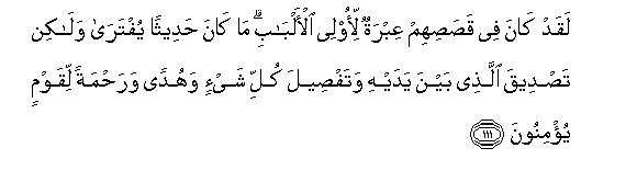 111. Laqad kana fee qasasihim AAibratun li-olee al-albabi ma kana hadeethan yuftara walakin tasdeeqa allathee bayna yadayhi watafseela kulli shay-in wahudan warahmatan liqawmin yu/minoona