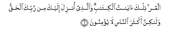 1. Alif-lam-meem-ra tilka ayatu alkitabi waallathee onzila ilayka min rabbika alhaqqu walakinna akthara alnnasi la yu/minoona