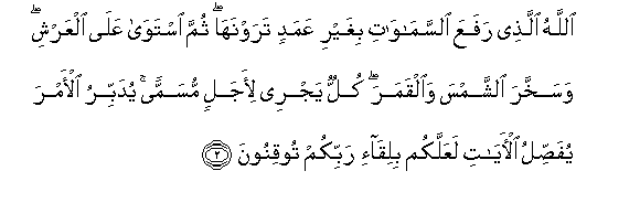 2. Allahu allathee rafaAAa alssamawati bighayri AAamadin tarawnaha thumma istawa AAala alAAarshi wasakhkhara alshshamsa waalqamara kullun yajree li-ajalin musamman yudabbiru al-amra yufassilu al-ayati laAAallakum biliqa-i rabbikum tooqinoona