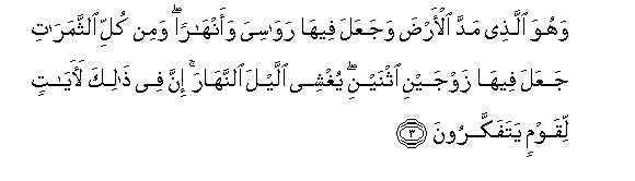 3. Wahuwa allathee madda al-arda wajaAAala feeha rawasiya waanharan wamin kulli alththamarati jaAAala feeha zawjayni ithnayni yughshee allayla alnnahara inna fee thalika laayatin liqawmin yatafakkaroona