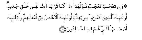 5. Wa-in taAAjab faAAajabun qawluhum a-itha kunna turaban a-inna lafee khalqin jadeedin ola-ika allatheena kafaroo birabbihim waola-ika al-aghlalu fee aAAnaqihim waola-ika as-habu alnnari hum feeha khalidoona