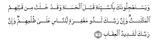 6. WayastaAAjiloonaka bialssayyi-ati qabla alhasanati waqad khalat min qablihimu almathulatu wa-inna rabbaka lathoo maghfiratin lilnnasi AAala thulmihim wa-inna rabbaka lashadeedu alAAiqabi