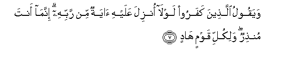 7. Wayaqoolu allatheena kafaroo lawla onzila AAalayhi ayatun min rabbihi innama anta munthirun walikulli qawmin hadin