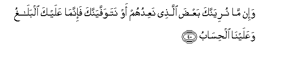 40. Whether We shall show thee (within thy life-time) part of what we promised them or take to ourselves thy soul (before it is all accomplished),- thy duty is to make (the Message) reach them: it is our part to call them to account.