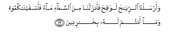 22. Waarsalna alrriyaha lawaqiha faanzalna mina alssama-i maan faasqaynakumoohu wama antum lahu bikhazineena