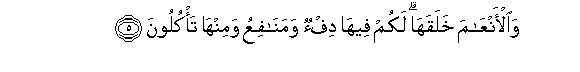 5. Waal-anAAama khalaqaha lakum feeha dif-on wamanafiAAu waminha ta-kuloona