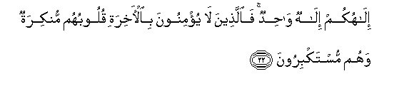 22. Ilahukum ilahun wahidun faallatheena la yu/minoona bial-akhirati quloobuhum munkiratun wahum mustakbiroona