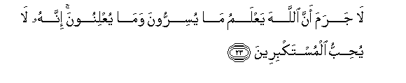 23. La jarama anna Allaha yaAAlamu ma yusirroona wama yuAAlinoona innahu la yuhibbu almustakbireena
