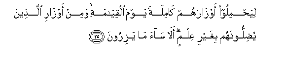 25. Liyahmiloo awzarahum kamilatan yawma alqiyamati wamin awzari allatheena yudilloonahum bighayri AAilmin ala saa ma yaziroona