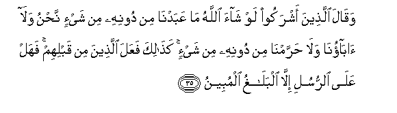 35. Waqala allatheena ashrakoo law shaa Allahu ma AAabadna min doonihi min shay-in nahnu wala abaona wala harramna min doonihi min shay-in kathalika faAAala allatheena min qablihim fahal AAala alrrusuli illa albalaghu almubeenu