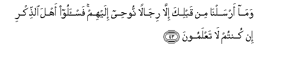 43. Wama arsalna min qablika illa rijalan noohee ilayhim fais-aloo ahla alththikri in kuntum la taAAlamoona