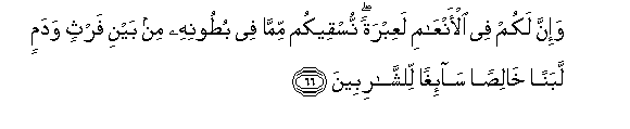 66. Wa-inna lakum fee al-anAAami laAAibratan nusqeekum mimma fee butoonihi min bayni farthin wadamin labanan khalisan sa-ighan lilshsharibeena